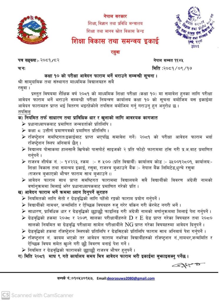 कक्षा १० को परीक्षा आवेदन फाराम भर्नु भराउनु हुन अनुरोध छ ।